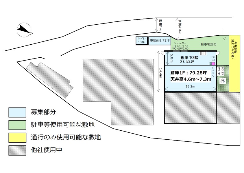 | 面積内訳 | 倉庫1階:79.28坪 倉庫中2階:27.53坪 事務所:9.75坪 |